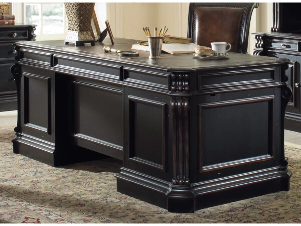 Traditional executive desk with a bonded leather top, carved scroll details, and a black finish over cherry veneers. Includes 7 drawers with two file drawers, a drop-front keyboard drawer, and two pullout writing slides.