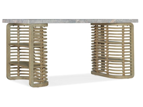 Writing desk in light driftwood pecan veneer with rope and cane accents and a stone veneer top. Provides four fixed shelves, two on each end, for storage.