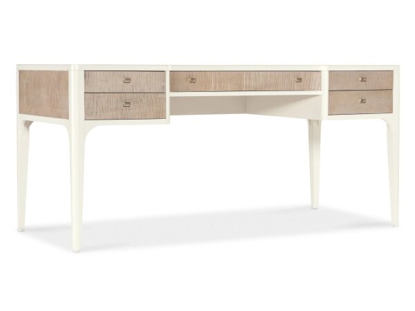 Writing desk in an almond white finish with contrasting figured maple top, drawer fronts and sides, finished with small gold knob pulls. Includes 5 drawers for everyday office storage.