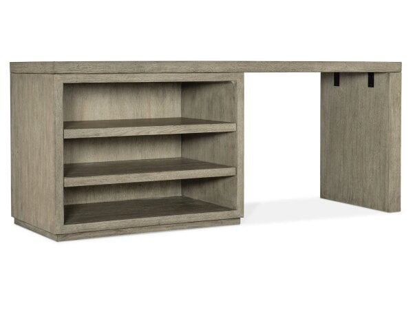 72 in. desk in smoked gray Mink oak veneers with one leg end panel and an open cabinet. Two adjustable shelves provide accessible storage; finished back for floating placement.