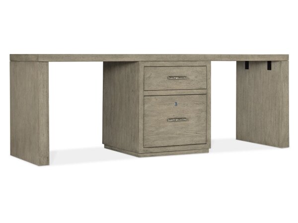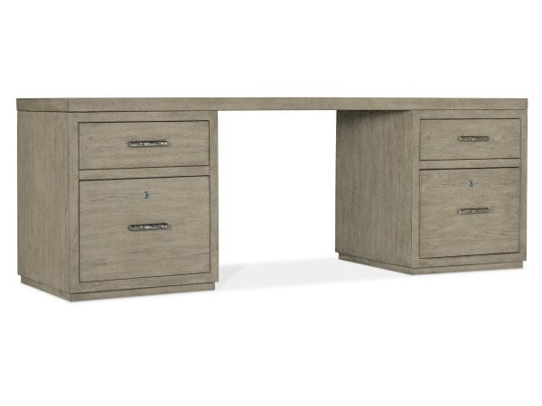 72 in. desk in smoked gray Mink oak veneers with two small file pedestals. Each includes a utility drawer and a locking file drawer with pendaflex; finished back for floating placement.