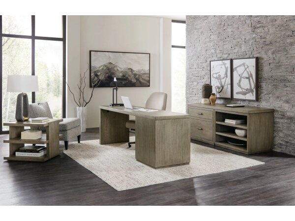 72 in. desk in smoked gray Mink oak veneers with one leg end panel and a lateral file. Includes a utility drawer and a locking file drawer with pendaflex; finished back for floating placement.