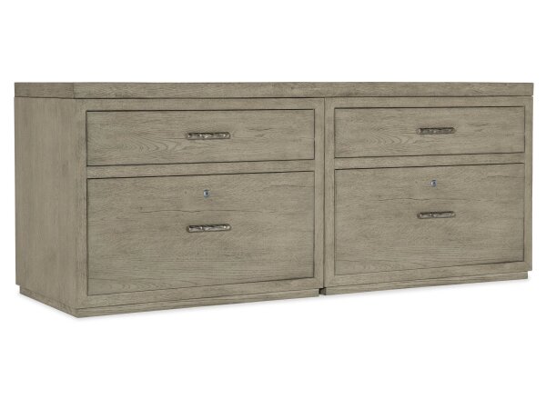 Smoked gray Mink oak-veneer credenza with a 72 in. top and two lateral files. Four drawers include two utility drawers and lower locking file drawers with pendaflex; finished back for floating placement.