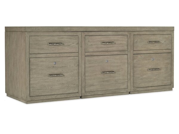 Smoked gray Mink oak-veneer credenza with a 72 in. top and three small file units. Six drawers include utility storage and locking file drawers with pendaflex; accented by antique pewter metal bar pulls.