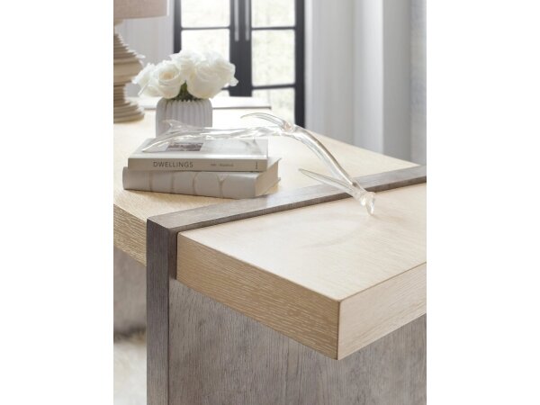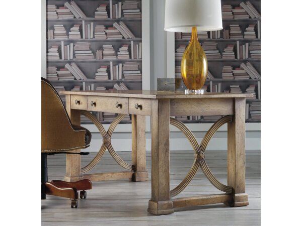 This Modern Farmhouse writing desk is crafted from poplar solids and knotty white oak veneers, featuring a dusty charcoal finish with heavy distressing. It includes three full extension drawers, slat accents, and washed brass elongated bar pull hardware f