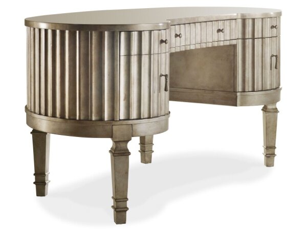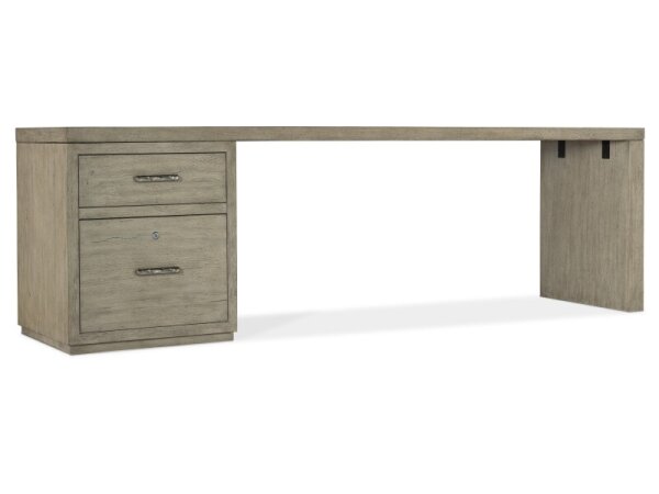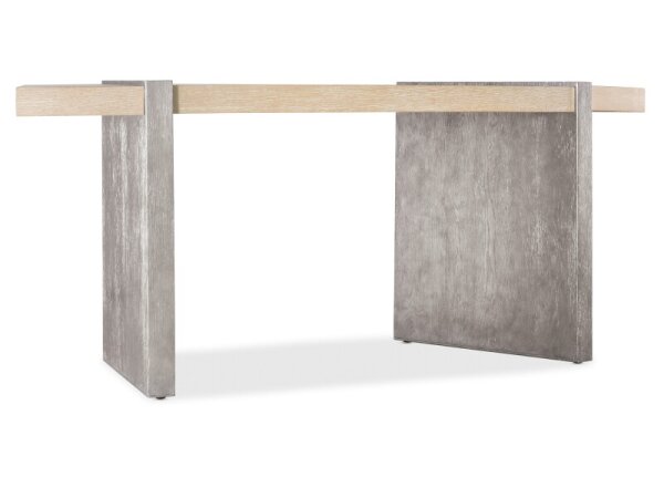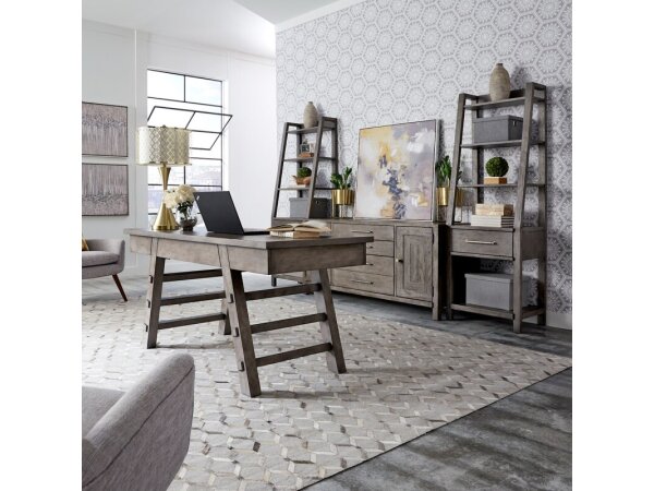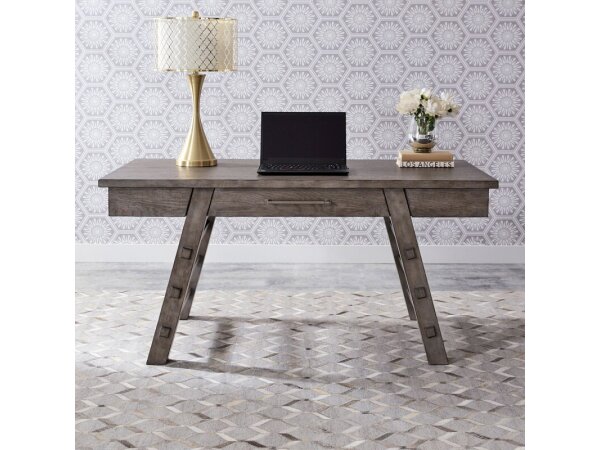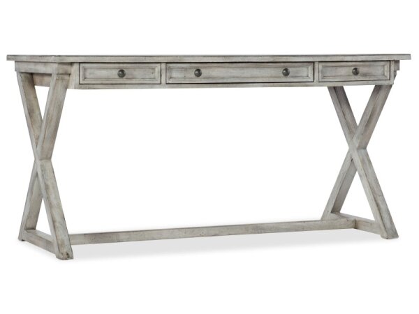 This Modern Farmhouse writing desk is crafted from poplar solids and knotty white oak veneers, featuring a dusty charcoal finish with heavy distressing. It includes three full extension drawers, slat accents, and washed brass elongated bar pull hardware f