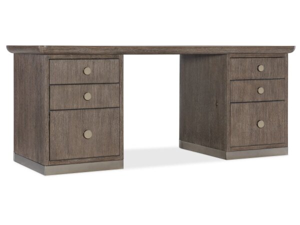 Modern executive desk in wire-brushed Quartered Oak with Diamond finish and metal accents. Two locking file drawers support letter/legal files, plus four utility drawers with removable dividers and a mouse pad/pencil tray.