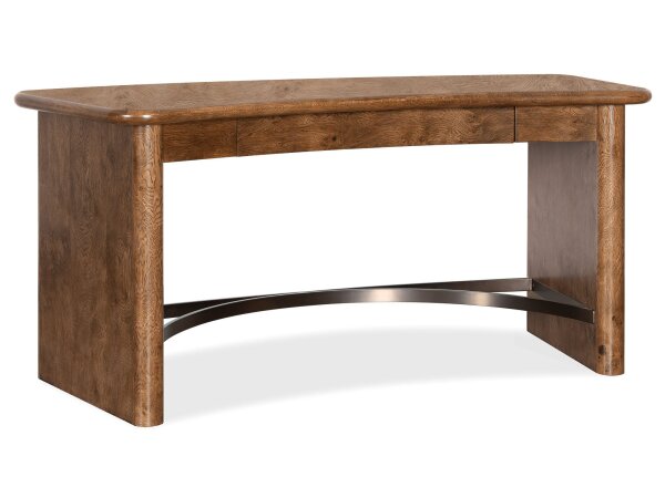 Refined writing desk in oak solids and veneers with a sculptural bow-front silhouette and bronze metal stretcher. A single drawer supports drop-front keyboard use for compact, stylish workspaces.