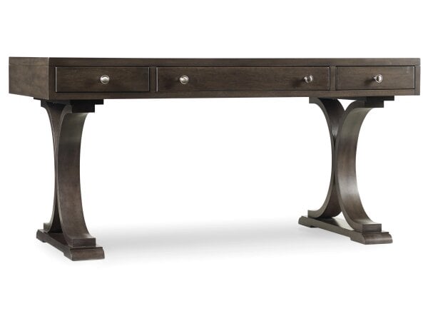 Traditional writing desk with a lyre-like base and walnut-colored rustic finish. Features three drawers including a drop-front keyboard drawer, removable dividers, and a writing insert with pencil tray.