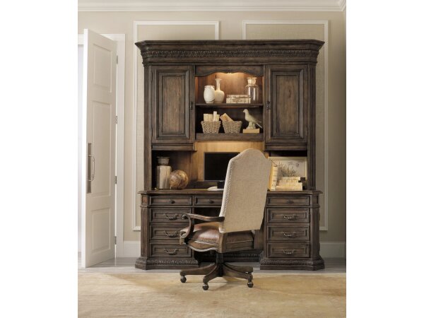 Executive desk with a chevron-veneer top and bonded-leather writing surface in a walnut rustic finish. Includes a drop-front keyboard drawer, utility storage, and two locking letter/legal file drawers.
