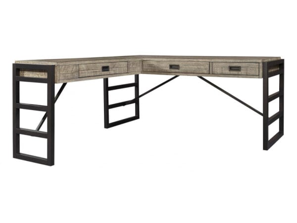 Industrial-craftsman writing desk in mango wood with iron accents and a gray metal frame. Includes 3 drawers: a drop-front center and utility drawers with removable dividers and a pencil tray.