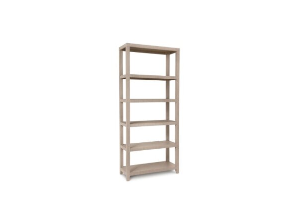Open etagere wrapped in lightly textured raffia with five wide shelves for airy storage and display. Raffia and wood construction; 40 in. W x 16 in. D x 90 in. H.