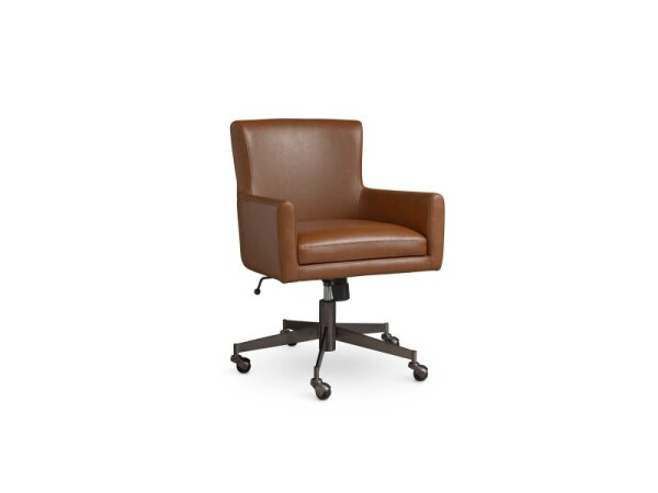 Modern executive office chair with sloping arms and a low-profile wingback, featuring a 5-star base with 360° swivel plus adjustable height and tilt. Vegan leather upholstery.
