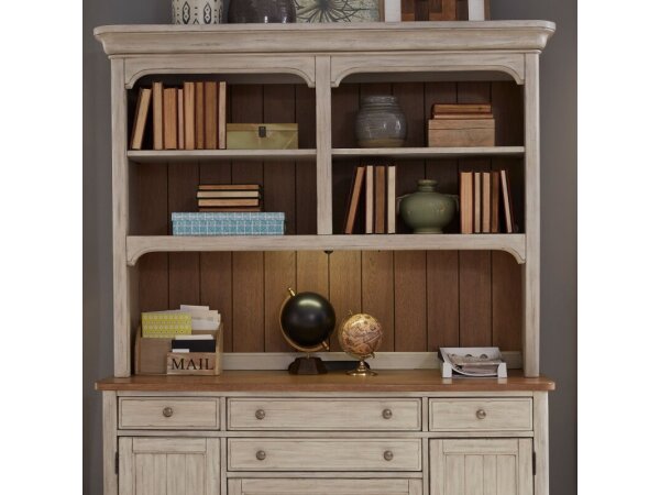 This Farmhouse Reimagined credenza hutch is crafted from pine solids with hickory and pine veneers in a two-toned antique white finish. It features wire management cut-outs, LED lighting, and two adjustable shelves.