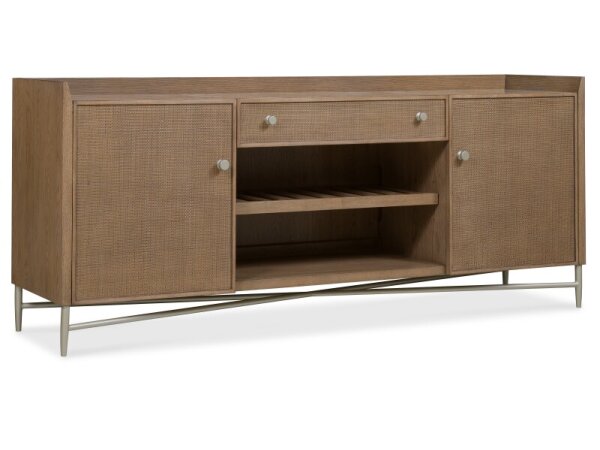 Transitional credenza in mixed materials: white oak veneers, cane, metal and marble, with four shelves and one drawer for versatile storage. A 78 in.-wide profile delivers substantial capacity.
