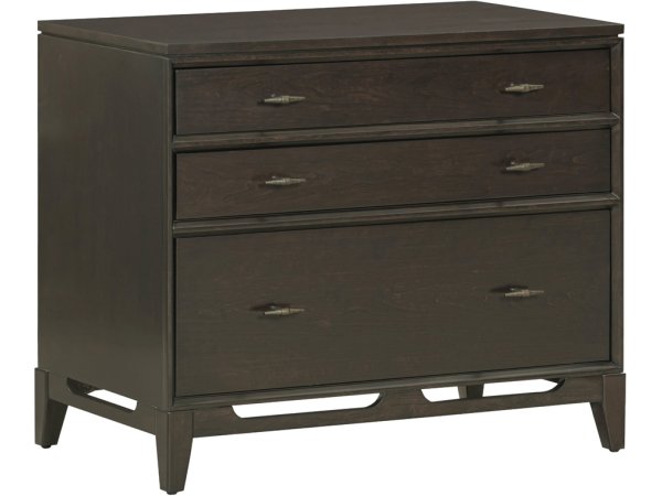 This Jr executive media lateral file blends European design with rubberwood solids and veneers, featuring an antique white and weathered brown finish. It includes two full extension drawers with a lock system for secured storage and canted corners.