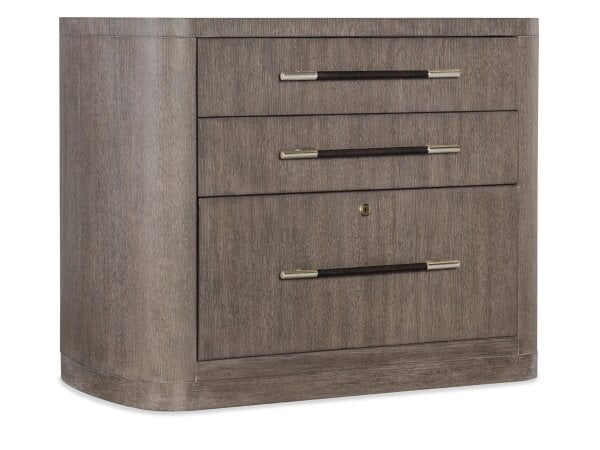 The Sonoma Road lateral file is crafted from poplar solids and hickory veneers with a weather-beaten bark finish and antique pewter hardware. It features two full extension, lockable file drawers for secure and deep storage.
