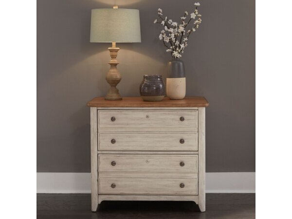 The Tanners Creek file cabinet, made from a rubberwood solid frame and scratch-resistant melamine, features a greystone finish. It includes three full extension drawers, a locking lateral file drawer for secure document storage, and mobile casters for eas