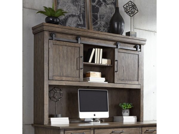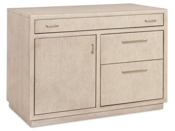 The Tanners Creek file cabinet, made from a rubberwood solid frame and scratch-resistant melamine, features a greystone finish. It includes three full extension drawers, a locking lateral file drawer for secure document storage, and mobile casters for eas