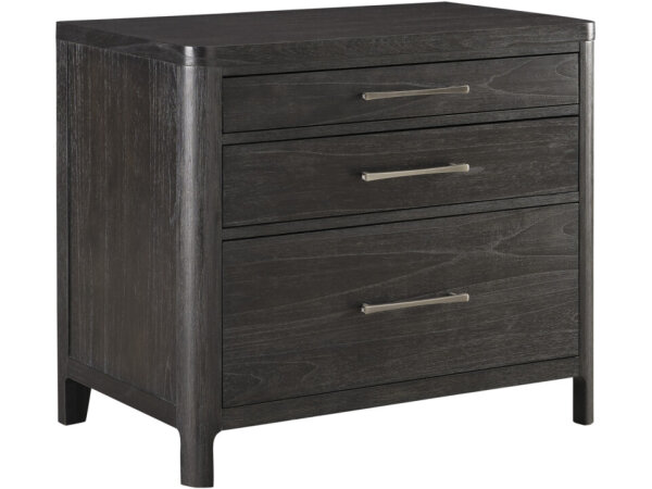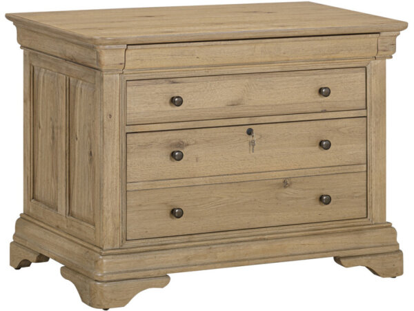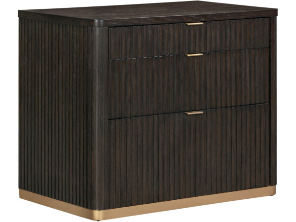 Transitional lateral file in white oak veneers with cane and metal accents, featuring two drawers for document storage. A 38 in.-wide profile fits compact offices.