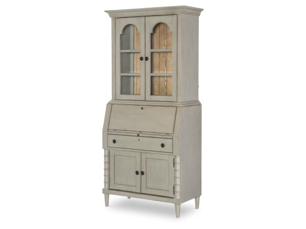 Credenza in an almond white finish featuring reverse-painted glass with brown, gray and purple tones. Provides 2 drawers and 2 shelves for file and storage organization.