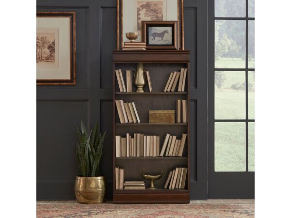 This 76-inch executive open bookcase is crafted with poplar solids and cherry and birch veneers, featuring a cognac finish. It includes five shelves, three of which are adjustable, for versatile storage.