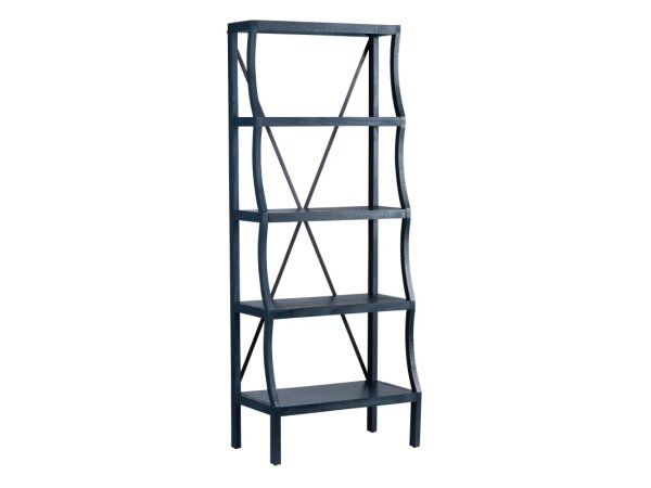 This unique Trellis Lane accent bookcase is crafted from solid mango wood with a weathered black finish and hand-carved end panels. It offers five shelves for storage, anchored by block legs.