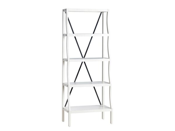 This unique Trellis Lane accent bookcase is crafted from mango wood with a weathered white finish and hand-carved end panels. It offers five shelves for storage, anchored by block legs.