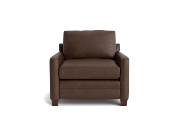 Leather track-arm chair with a loose box back and top-stitched seat cushion for modern casual comfort. Customizable leather and tapered legs suit living rooms or reading nooks.