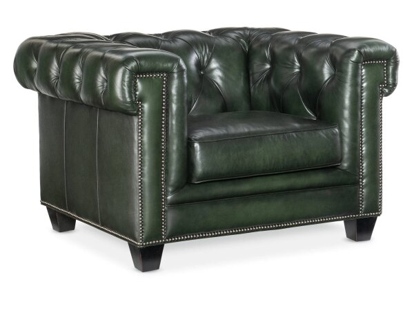 A leather track-arm accent chair with a loose box back and top-stitched seat cushion on tapered legs. Customizable leather and cushion feel, with optional nailhead trim.