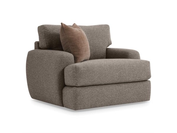 Rounded corners and padded arms craft an invitingly comfortable swivel chair.