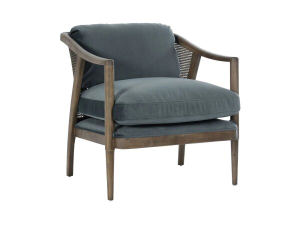 Sumptuous pillows rest against a unique T-back design for this luxe swivel chair.
