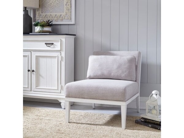 An armless Allyson Park accent chair featuring durable grey linen upholstery, white wire brushed tapered legs, and a solid wood frame. Includes a kidney pillow for extra comfort and is designed for small spaces.