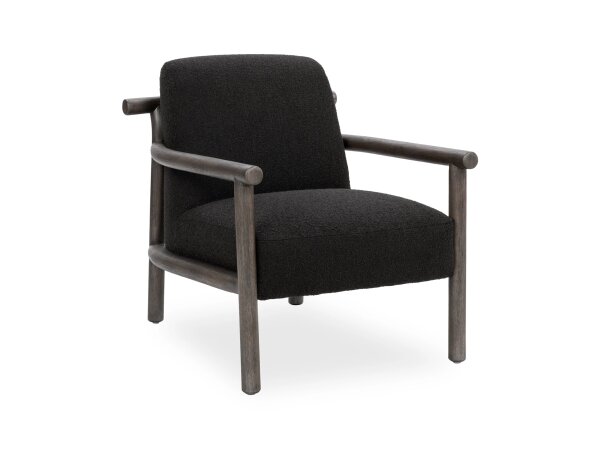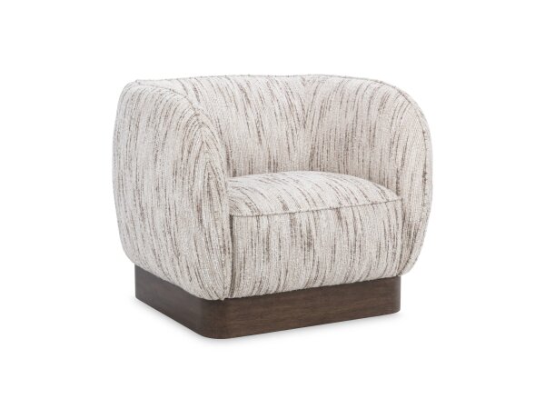 The Haley upholstered swivel cuddler chair features a curved silhouette, floating back and arms, and a functional swivel base. Its Midnight fabric offers soft textured yarns with a geometric weave.