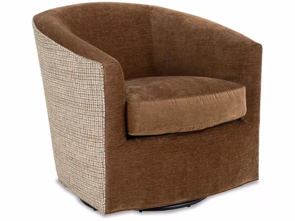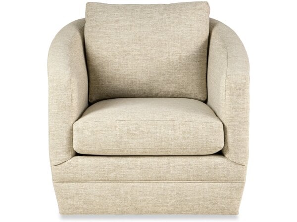 A modern barrel-back shape gives this comfy swivel chair a clean sophisticated look. It features track arms and an attached