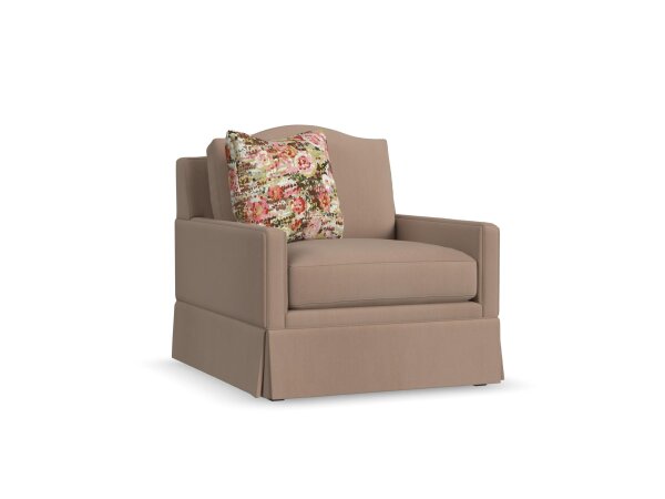 The Penelope Swivel Chair features a single back pillow and cushion with a Cloud Down fill for comfort. Its swivel base and tailored design make it suitable for modern living rooms.