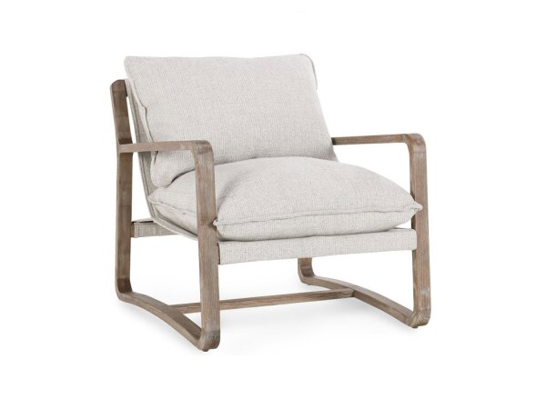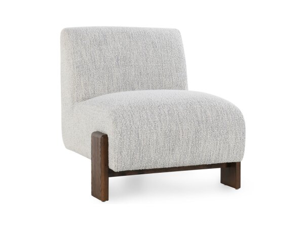 Accent chair with a channeled back and scalloped upholstered arms, offering a plush fabric seat and back. Wood frame features a soft smoked gray Mink finish.