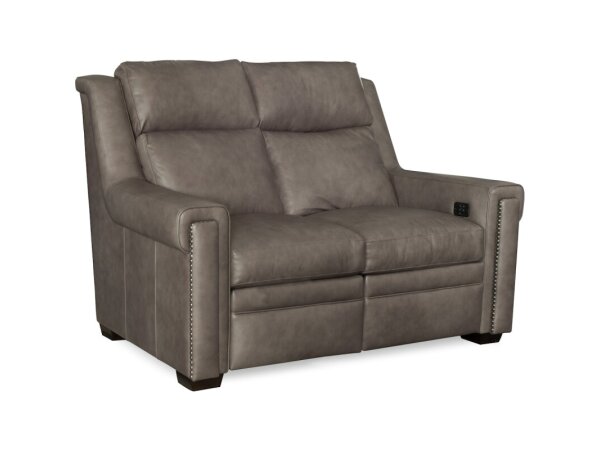Stationary leather loveseat with Spring Down cushions and a semi-attached, pillow-soft back for comfort. Transitional design with sinuous wire spring construction and standard nailhead trim.