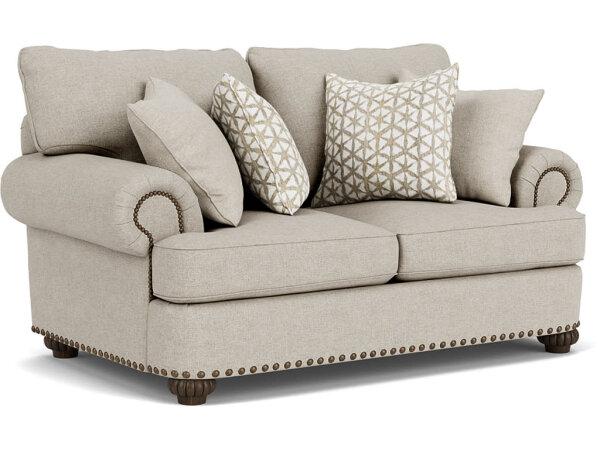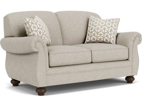 Traditional elegance gets a fresh reinterpretation with the Veda loveseat. The petite, pleated roll arms, adorned with a simple nailhead