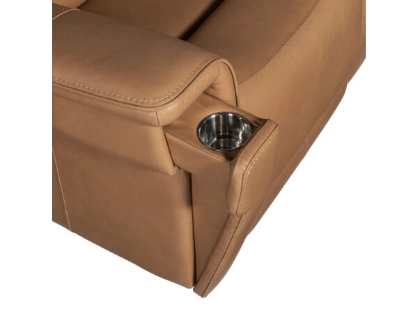 Leather power loveseat with two independently controlled seats that recline up to Zero Gravity. Wall-hugging frame-within-a-frame design and a power headrest that lowers flat maintain a sleek, view-from-all-sides profile with a vinyl-match back.