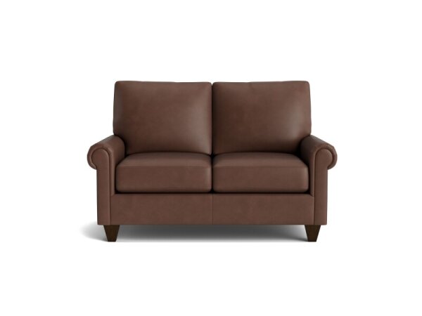 Leather roll-arm loveseat with extra padding and rounded curves, offering customizable cushion comfort for transitional to contemporary spaces.