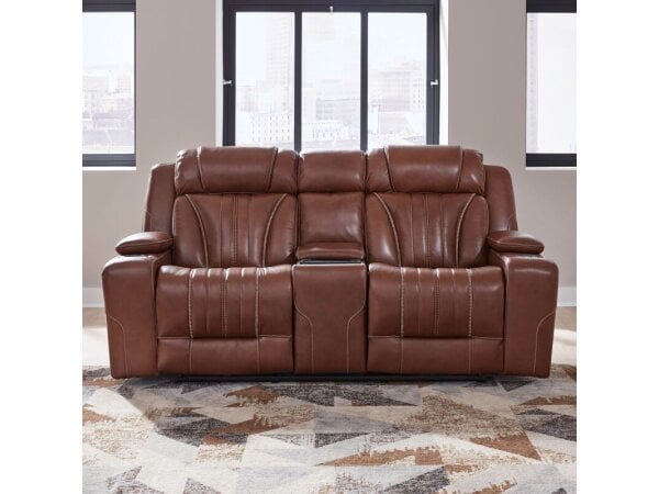 The Bennett loveseat with console offers dual zero gravity power recline with power articulating headrests and is finished in butternut semi-aniline leather. It features a storage console with AC and USB charging, plus removable stainless steel cupholders