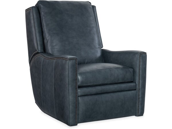 This manual pushback recliner features a divided back design, pad-over track arms, and antique brass nail head trim. It is upholstered in York Navy leather and built on a solid hardwood frame for durability.