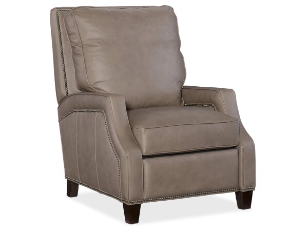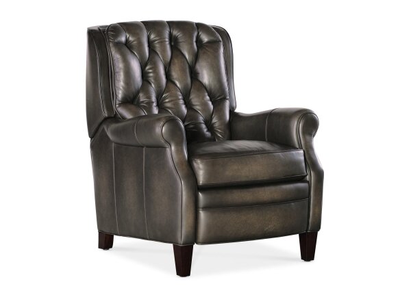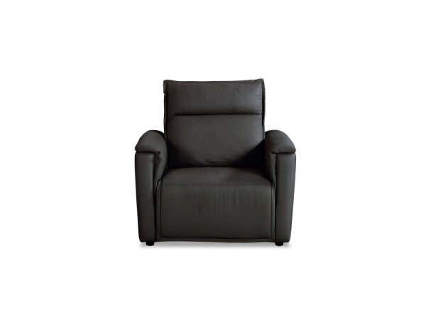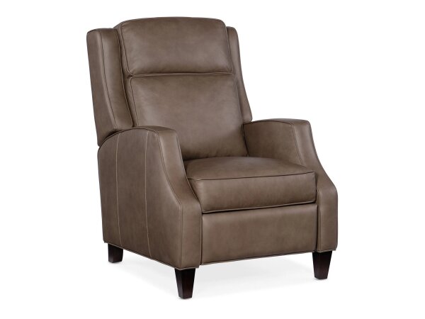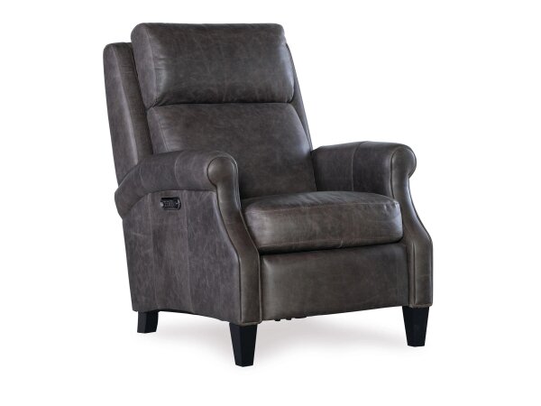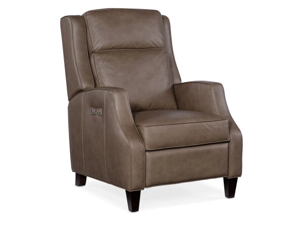 Top-grain leather zero-gravity power recliner with power headrest and seat-integrated controls. Built-in console offers wireless and USB charging with refined flange-welt details.