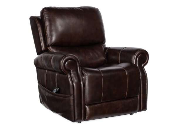 43 1/2" (110.5 cm) MS Living Room Montel Lay Flat Power Recliner with Power Headrest & Lumbar enriched by Leather design elements, making it a distinctive interior accent.