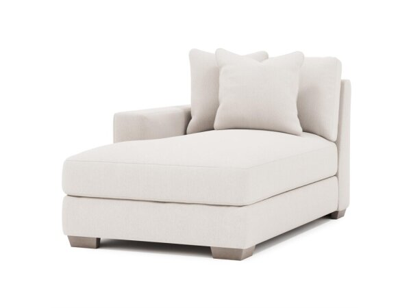 This Carrington Armless Chair in York Sand features a transitional style, offering simple yet sophisticated lines that blend traditional and contemporary elements.