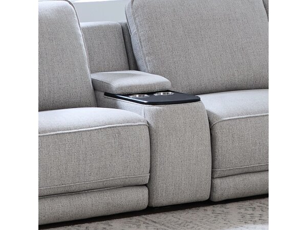 This modular storage console is designed to fit within a sectional, featuring a wireless charging pad, USB-A and USB-C ports, and hidden stainless steel cupholders. It also provides convenient interior storage for your living space.