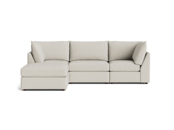 Modular sectional sofa with ottoman featuring weltless, top-stitched box seat cushions and removable back/seat cushions for easy cleaning, set on walnut-tone wood legs.