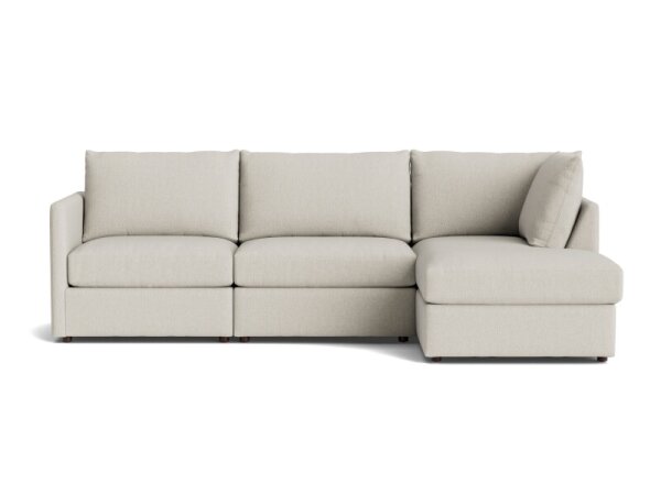 Modular chaise sectional with ottoman for flexible seating, featuring top-stitched, weltless box seats and removable back and seat cushions. Fabric upholstery and walnut-tone wood legs; artisan crafted in the USA.