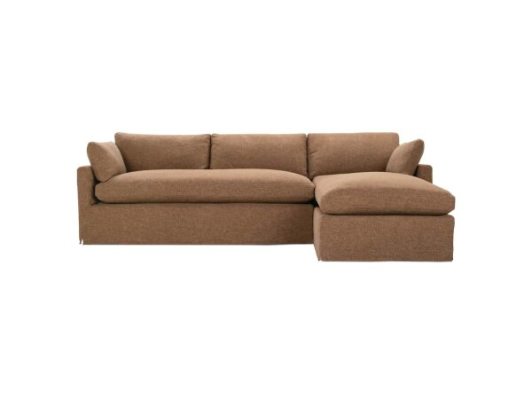 Modular double-chaise sectional with top-stitched, weltless box cushions and loose knife-edge backs. Fabric upholstery, removable cushions, walnut-tone legs; 154 in. W x 65 in. D x 38.5 in. H.